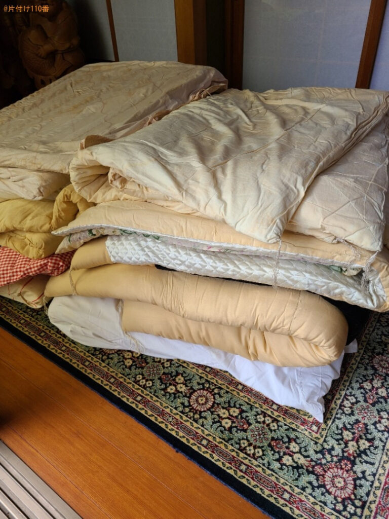 | 担当のコメント | 布団の処理にお困りのお客様からご相談いただきました。本日回収可能なことがご依頼の決め手になったようです。片付け110番では、最短即日のお伺いが可能です。不用品がございましたらまたいつでもご相談ください |