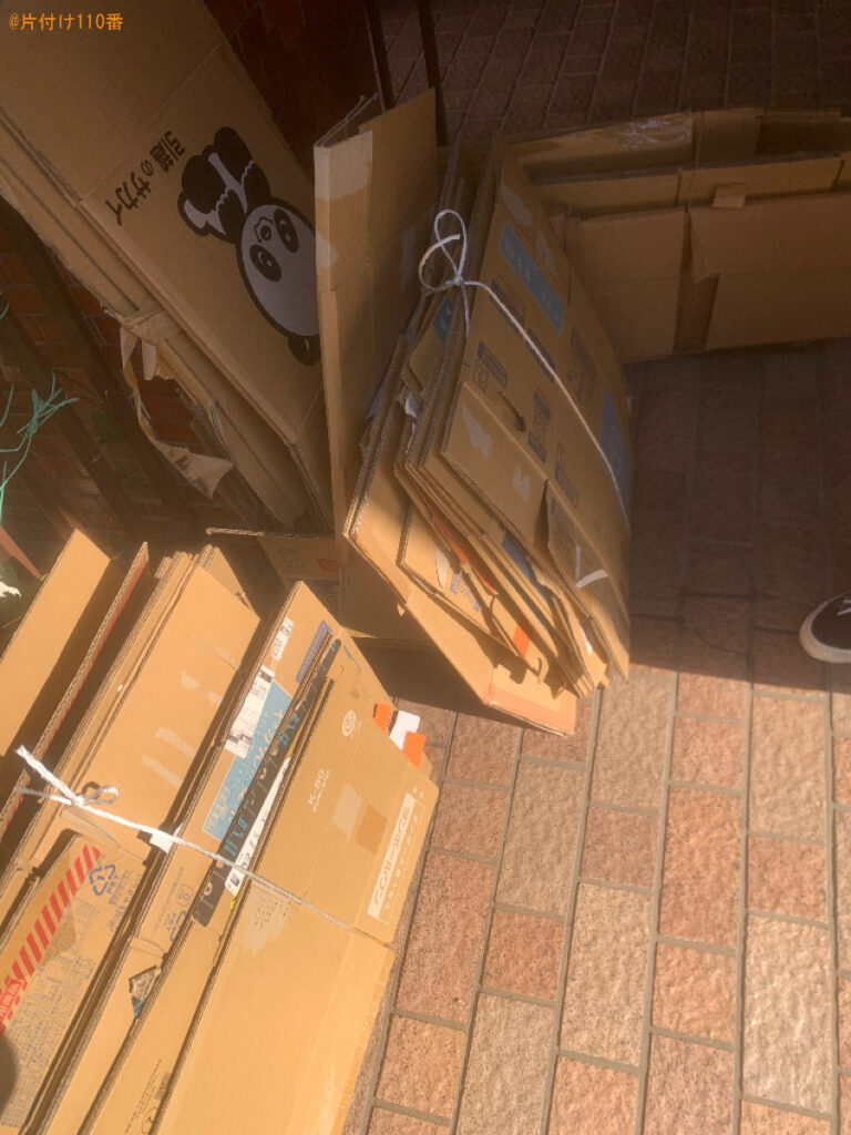 | 担当のコメント | 段ボールの処理にお困りのお客様からご相談いただきました。見積り額がご予算内だったことがご依頼の決め手になったようです。大変助かりました!とお喜びいただけました。不用品にお困りの際はまたいつでもご相談ください。 |